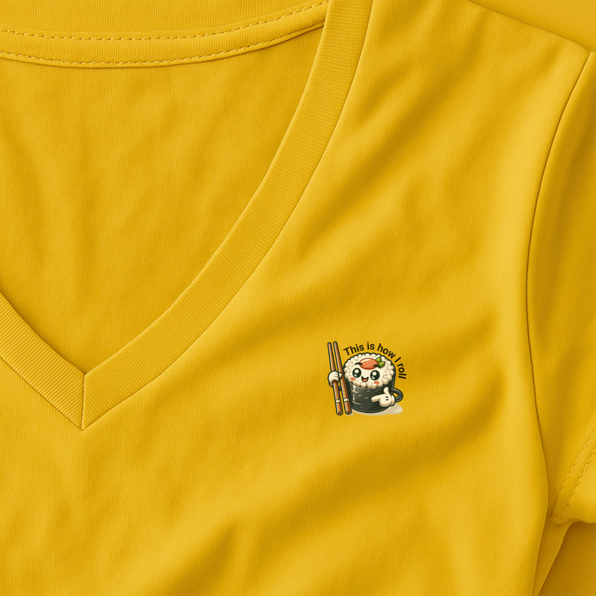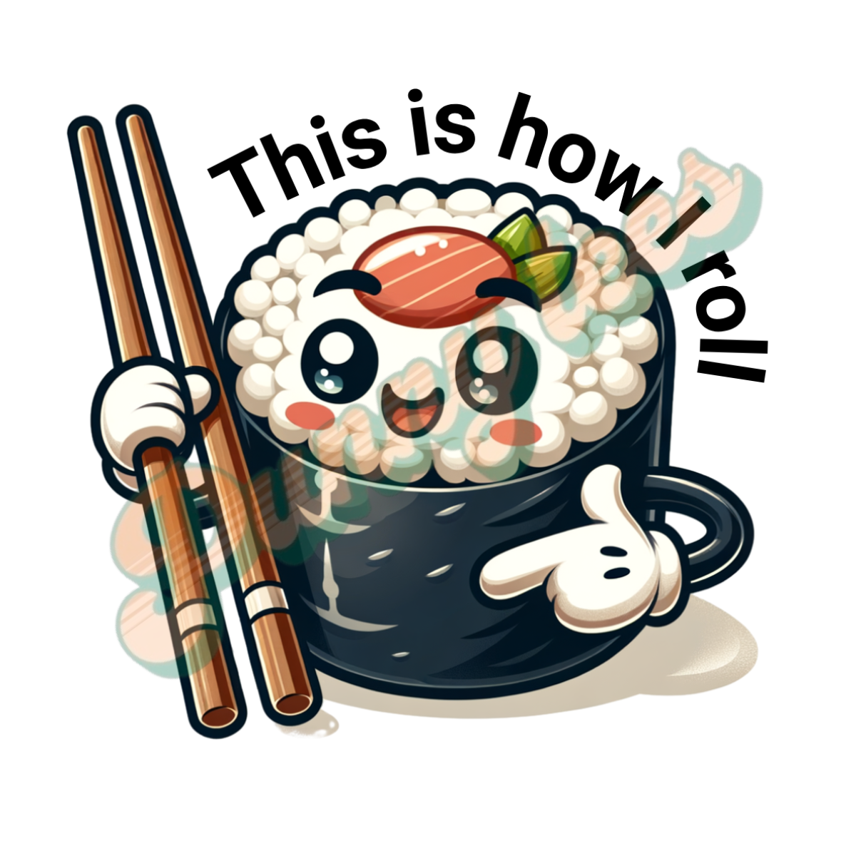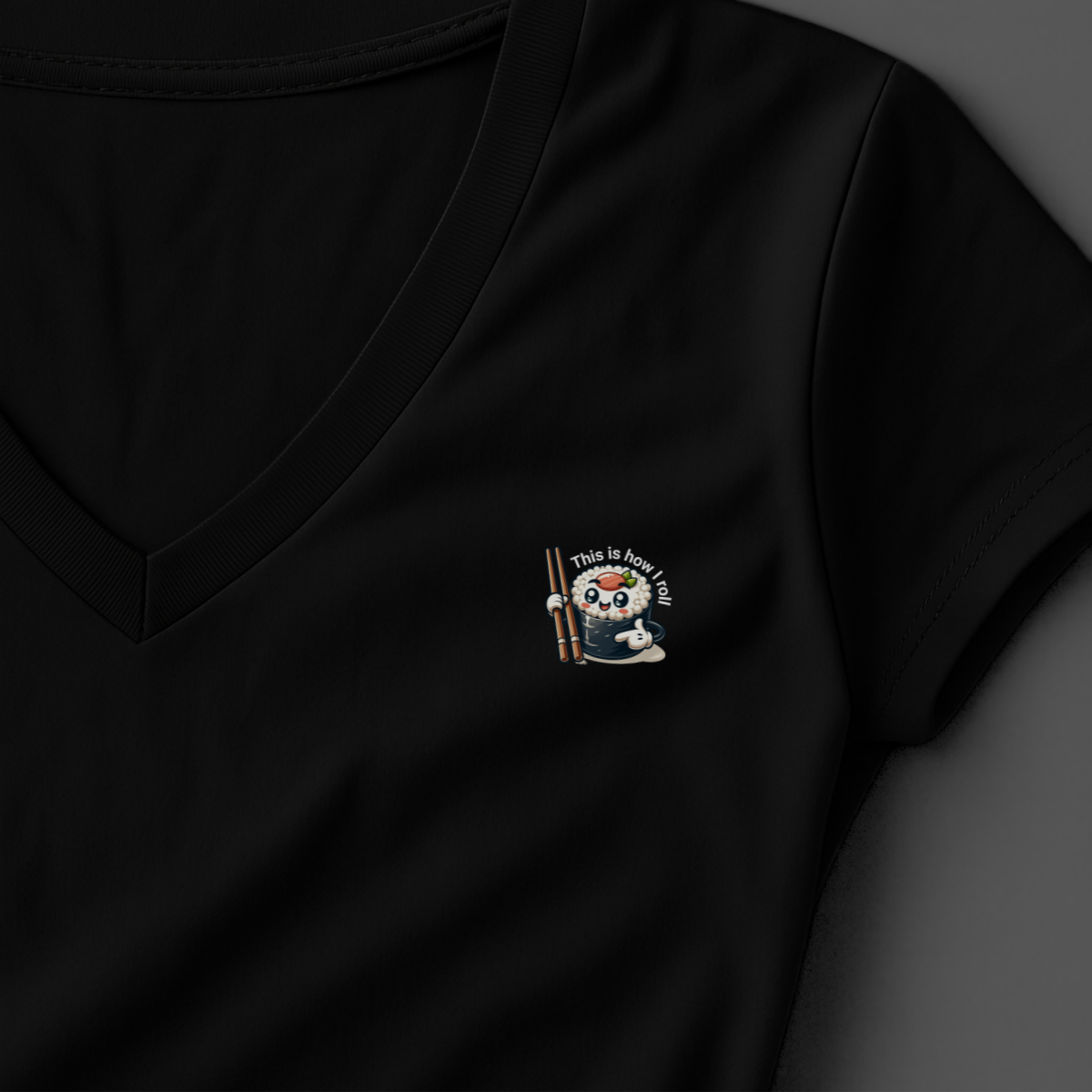 Het design toont een sushiroll die z’n eigen pad kiest met chopsticks in de handen alsof hij z’n leven stevig beet heeft. De tekst “This Is How I Roll” is een heerlijke dubbelzinnige zin: enerzijds over hoe je rolt door het leven, anderzijds letterlijk over… sushi rollen.