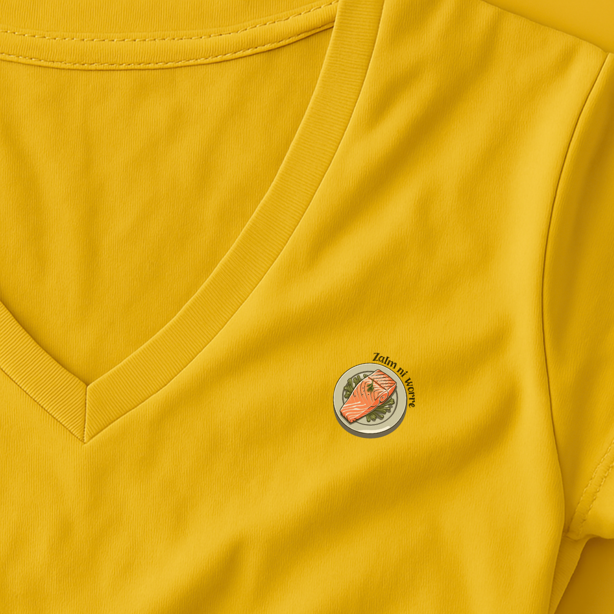 Het design toont een zalmmoot. Schattig uitgewerkt met zachte lijnen en een vleugje eigenzinnige flair. De zin“Zalm ni worre” is dan weer een fonetische knipoog naar “Zal hem niet worden”.
